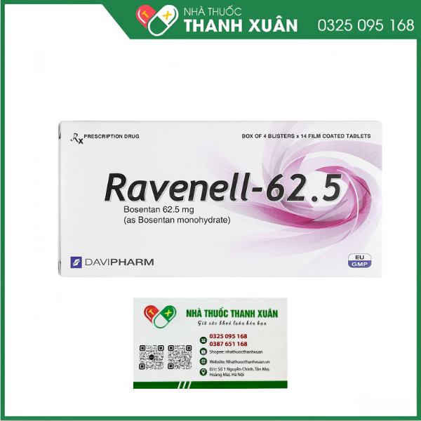 Thuốc Ravenell-62.5 được sản xuất bởi Công ty cổ phần Dược phẩm Đạt Vi Phú - Việt Nam với hoạt chất chính là Bosentan. Thuốc chỉ định điều trị tăng áp lực động mạch phổi (PAH) để cải thiện khả năng gắng sức và triệu chứng ở bệnh nhân độ III theo phân loại của WHO. Hiệu quả đã được chứng minh trong: Tăng áp lực động mạch phổi tiên phát (vô căn hoặc di truyền), tăng áp lực động mạch phổi thứ phát do xơ cứng bì mà không có bệnh phổi kẽ nặng.