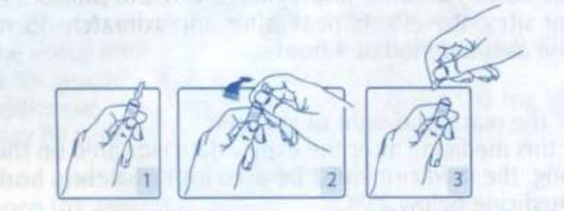 Hình 2 và 3: Nắm đầu ống tiêm giữa ngón tay cái và ngón trỏ (ngón cái đặt ngay chấm màu trên ống), rồi dùng lực hướng ra phía sau để bẻ ống.