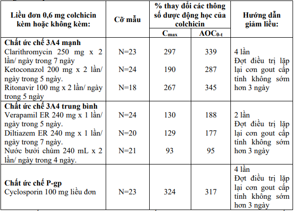 Nên giảm 4 lần liều colchicin khi phối hợp với thuốc ức chế P-gp và/ hoặc thuốc ức chế CYP3A4 mạnh. Giảm 2 lần liều colchicin được khuyến cáo khi dùng đồng thời với thuốc ức chế CYP3A4 trung bình.