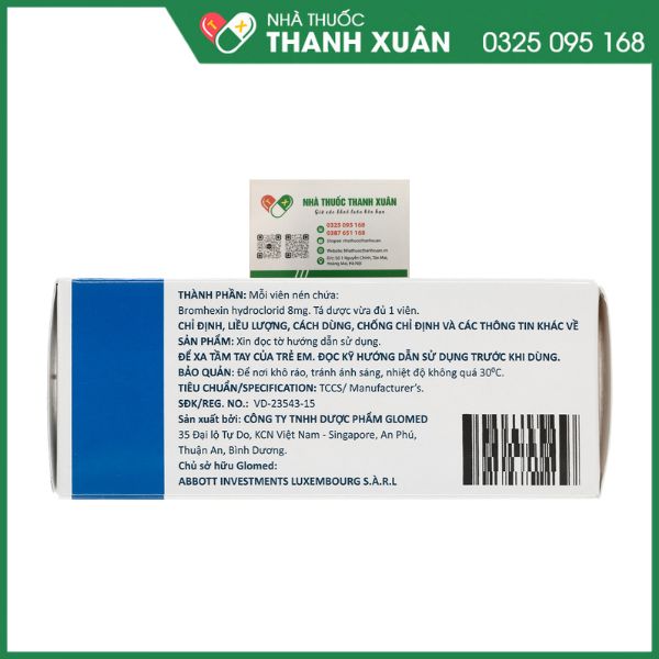Hoạt chất: Bromhexin hydroclorid 8mg