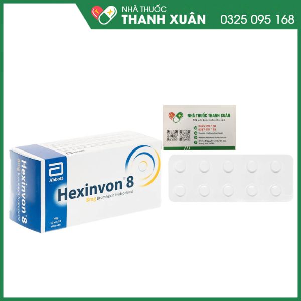 Thuốc Hexinvon 8 của Công ty CP Dược phẩm Glomed (Việt Nam) có thành phần chính Bromhexin Hydroclorid, được sử dụng để phân hủy chất tiết trong các bệnh phế quản - phổi. Thuốc được bào chế dưới dạng viên nén 8mg.