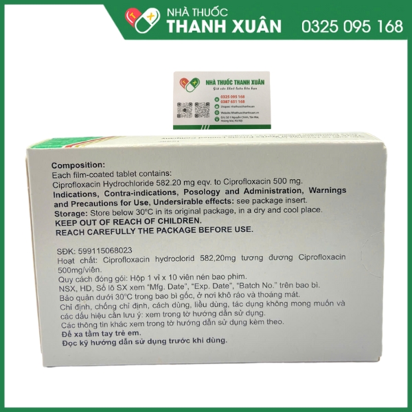 - Hoạt chất: Ciprofloxacin hydroclorid 582,20 mg tương đương ciprofloxacin 500mg.