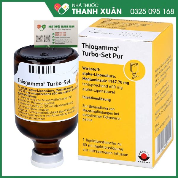 Thiogamma Turbo-Set là sản phẩm của công ty Solupharm Pharmazeutische Erzeugnisse GmbH - Đức. Thuốc có hoạt chất Acid thioctic (alpha-lipoic acid) dạng muối meglumin nhằm điều trị rối loạn cảm giác trong bệnh đa dây thần kinh đái tháo đường.