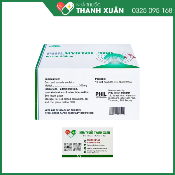 Thuốc Philmyrtol 300 được sản xuất bởi Công ty TNHH Phil Inter Pharma với hoạt chất chính là Myrtol 300mg.Thuốc có công dụng làm loãng đờm và thúc đẩy di chuyển, giúp dễ khạc đờm và giảm viêm trong các trường hợp : Viêm phế quản cấp tính-mạn tính.Viêm xoang mũi.