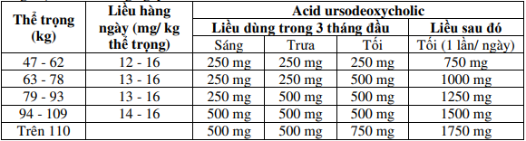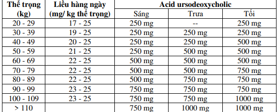 Liều hàng ngày tùy thuộc thể trọng, khoảng từ 750 - 1750 mg/ ngày (14 + 2 mg acid ursodesoxycholic/ kg thể trọng).